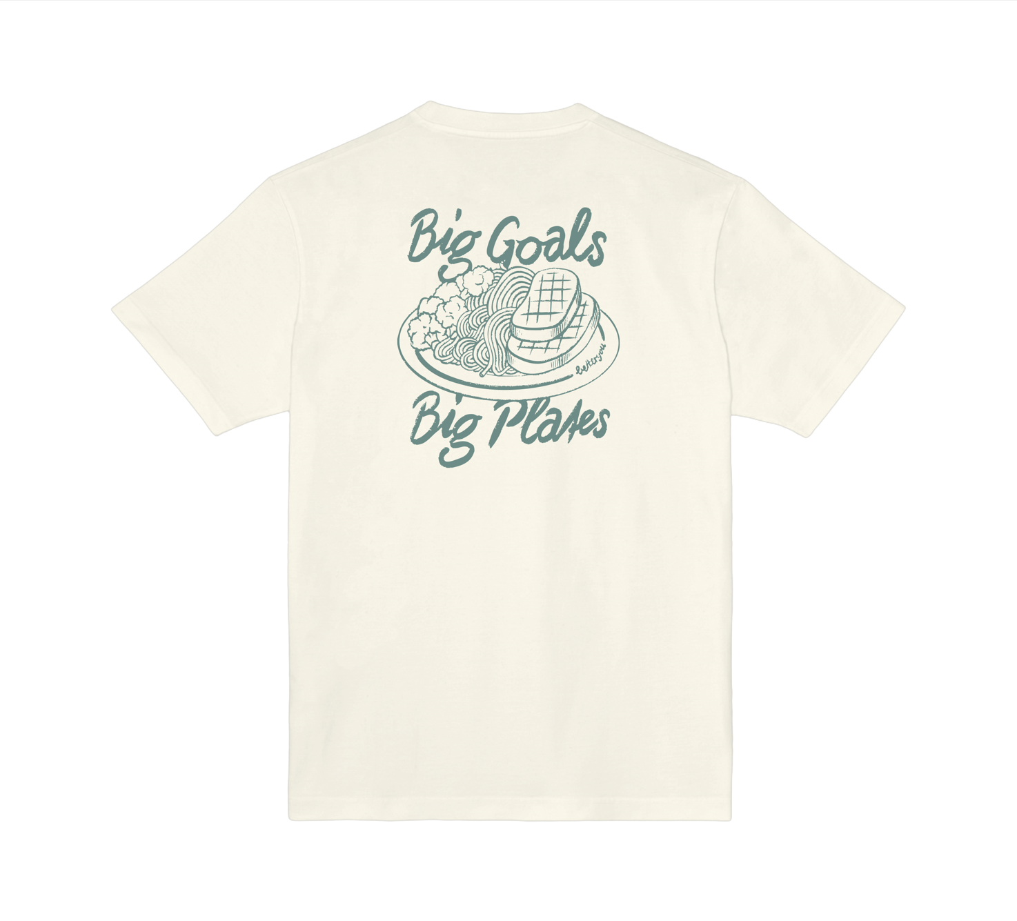 Zeige der Welt, wofür du stehst: Wer grosse Ziele hat, braucht auch genügend Energie! Unser exklusives Big Goals – Big Plates T-Shirt ist mehr als nur ein Kleidungsstück – es ist ein klares Statement für eine gesunde, kraftvolle und bewusste Lebensweise.