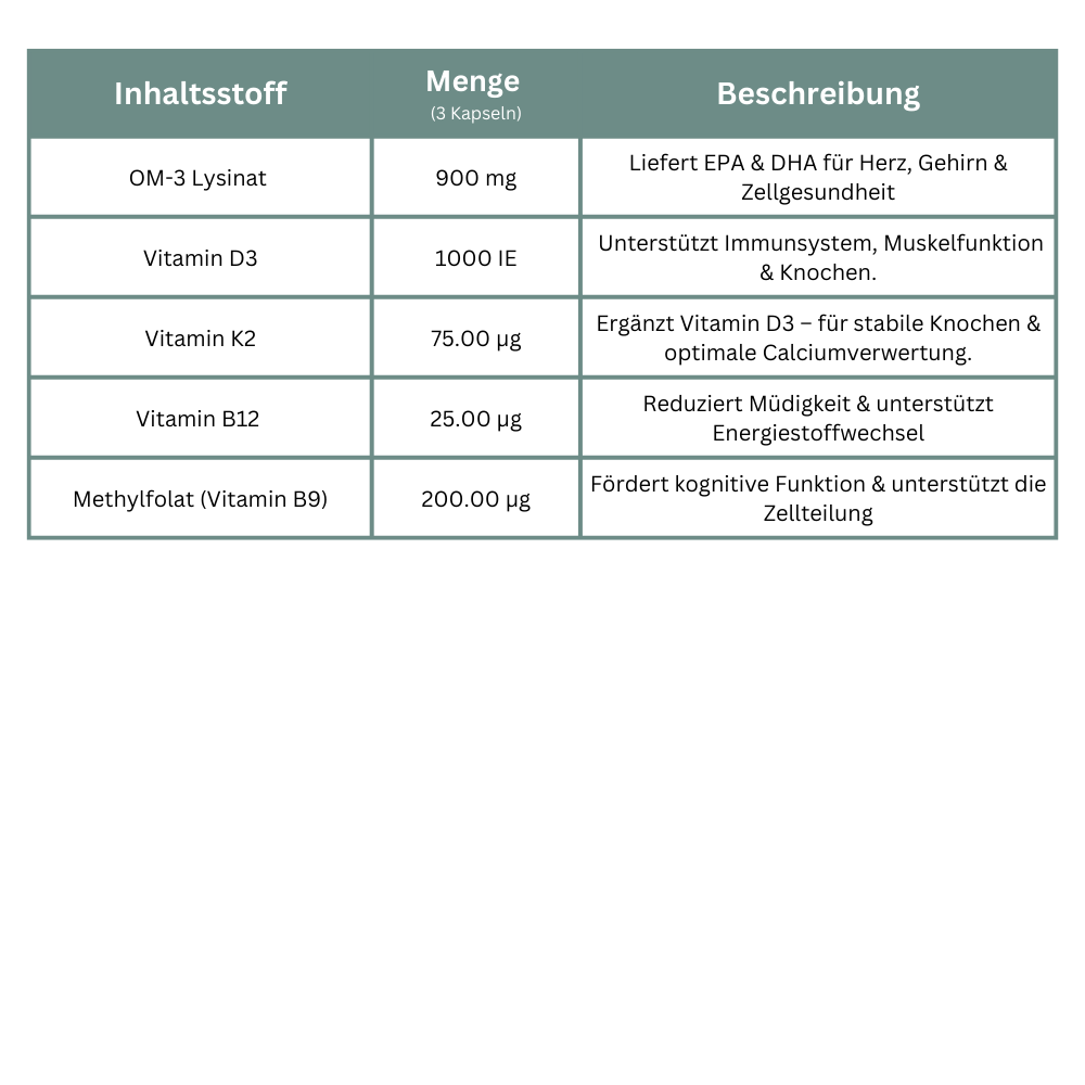 - Omega-3-Lysinat: Liefert EPA & DHA im optimalen Verhältnis – für Zellfunktion, Herzgesundheit & Gehirn.